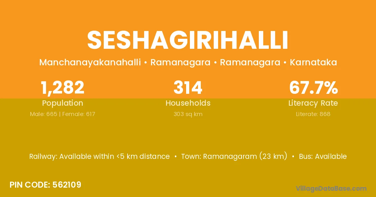 Ramanagaram (23 km) is the nearest town to Seshagirihalli village for major economic activities and is located approximately 23 km away.