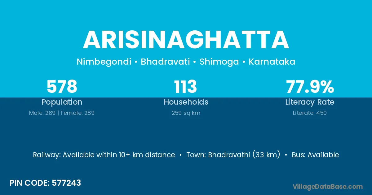 Arisinaghatta village has a total population of 578 people, of which 289 are males and 289 are females.