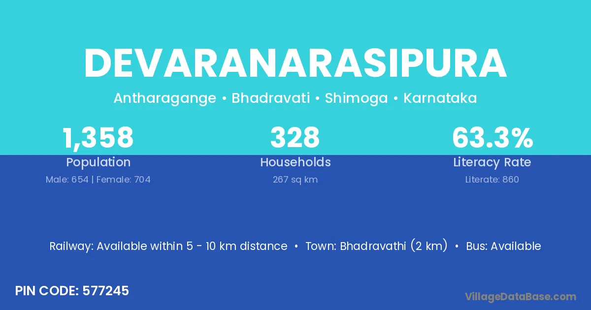 Bhadravathi (2 km) is the nearest town to Devaranarasipura village for major economic activities and is located approximately 2 km away.