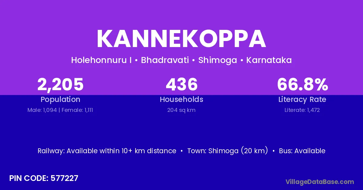 Shimoga (20 km) is the nearest town to Kannekoppa village for major economic activities and is located approximately 20 km away.