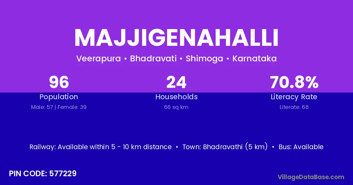 Bhadravathi (5 km) is the nearest town to Majjigenahalli village for major economic activities and is located approximately 5 km away.