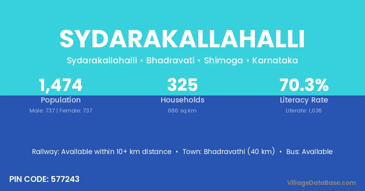Bhadravathi (40 km) is the nearest town to Sydarakallahalli village for major economic activities and is located approximately 40 km away.