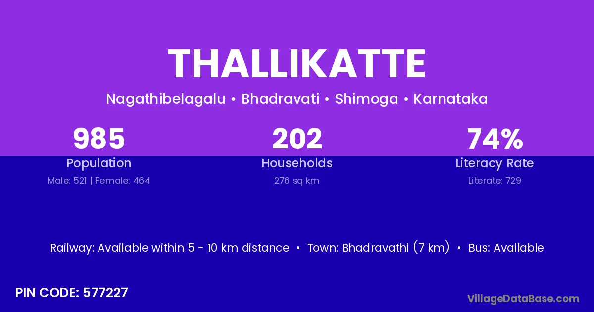 Bhadravathi (7 km) is the nearest town to Thallikatte village for major economic activities and is located approximately 7 km away.