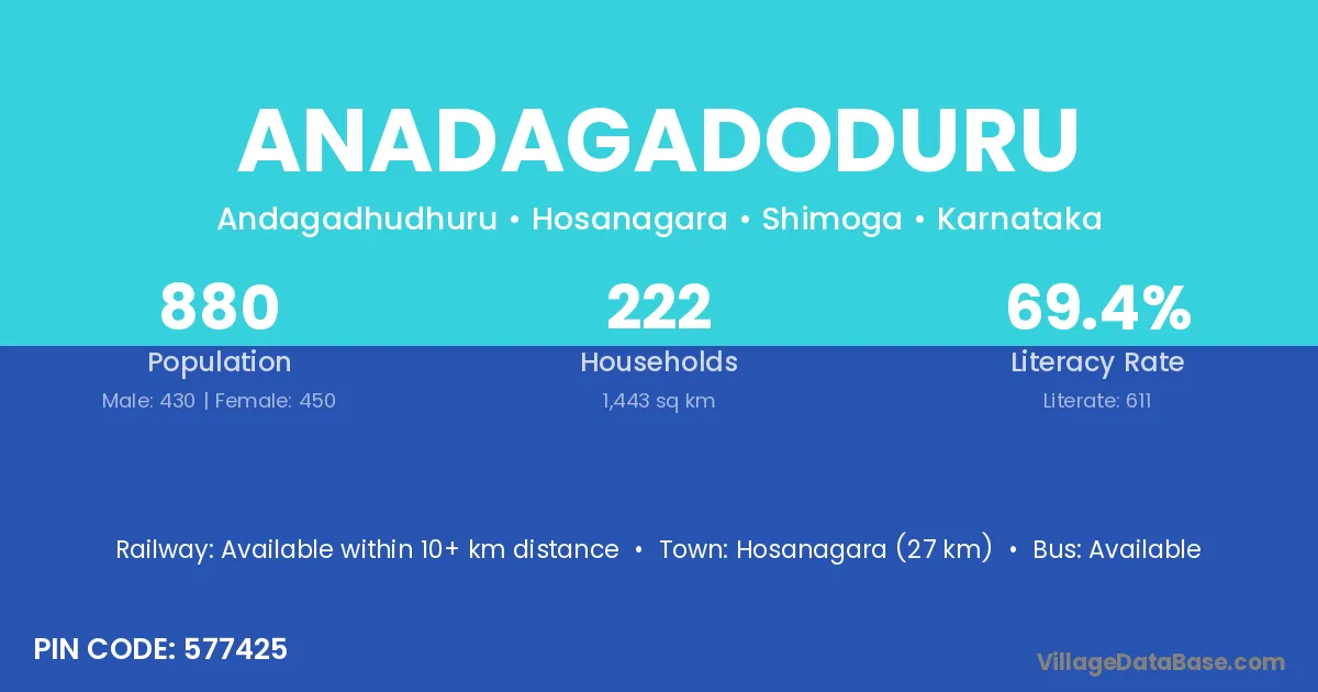 Hosanagara (27 km) is the nearest town to Anadagadoduru village for major economic activities and is located approximately 27 km away.