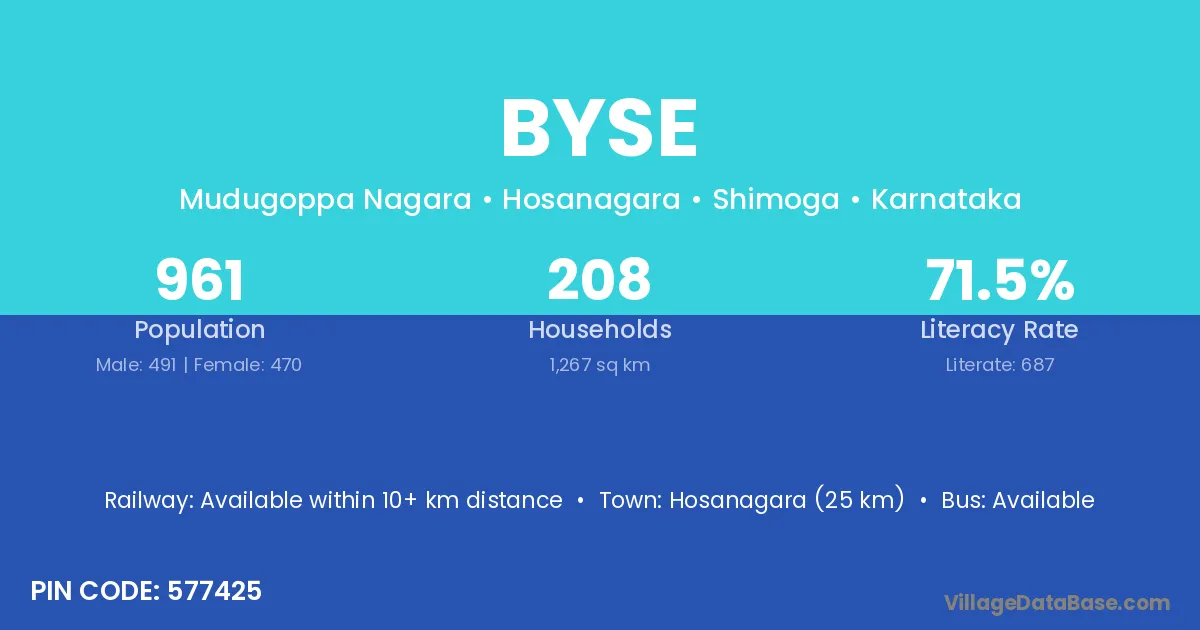 Hosanagara (25 km) is the nearest town to Byse village for major economic activities and is located approximately 25 km away.