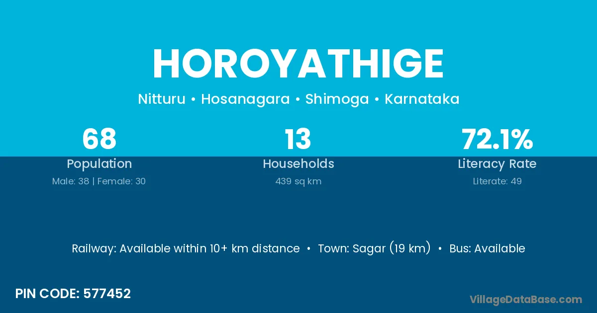 Sagar (19 km) is the nearest town to Horoyathige village for major economic activities and is located approximately 19 km away.