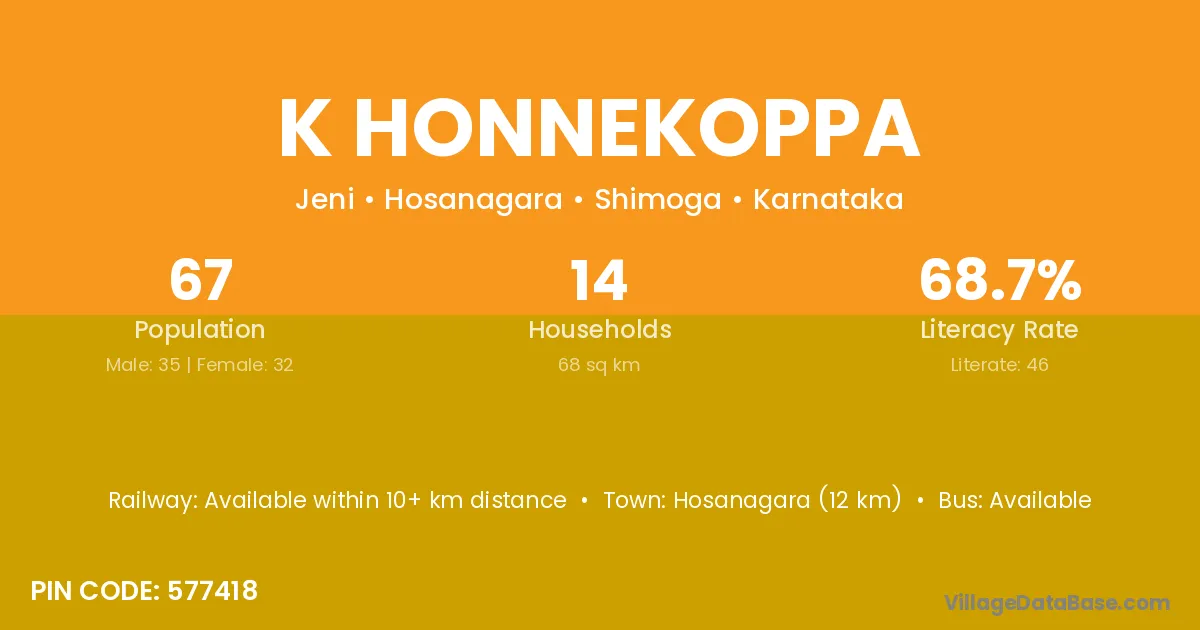 K Honnekoppa village has a total population of 67 people, of which 35 are males and 32 are females.