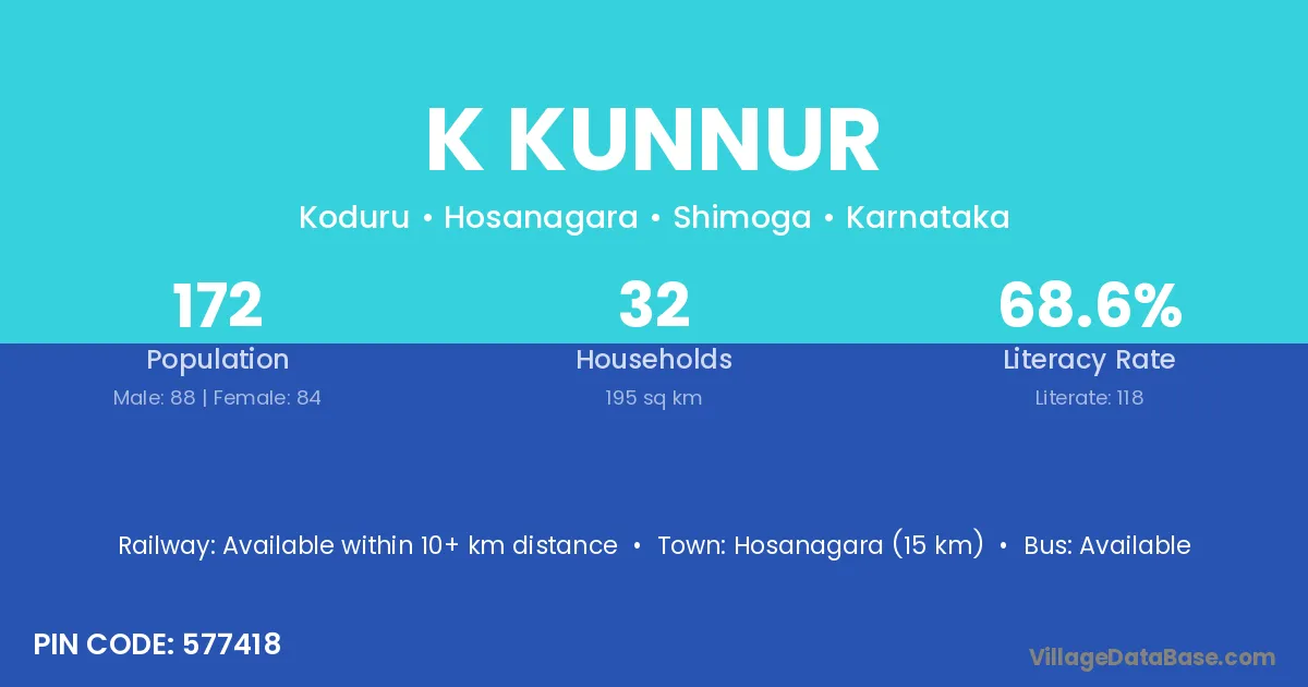 Hosanagara (15 km) is the nearest town to K Kunnur village for major economic activities and is located approximately 15 km away.