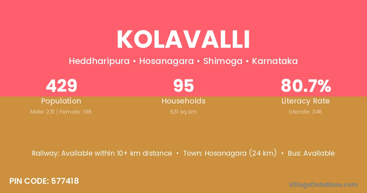 Kolavalli village has a total population of 429 people, of which 231 are males and 198 are females.