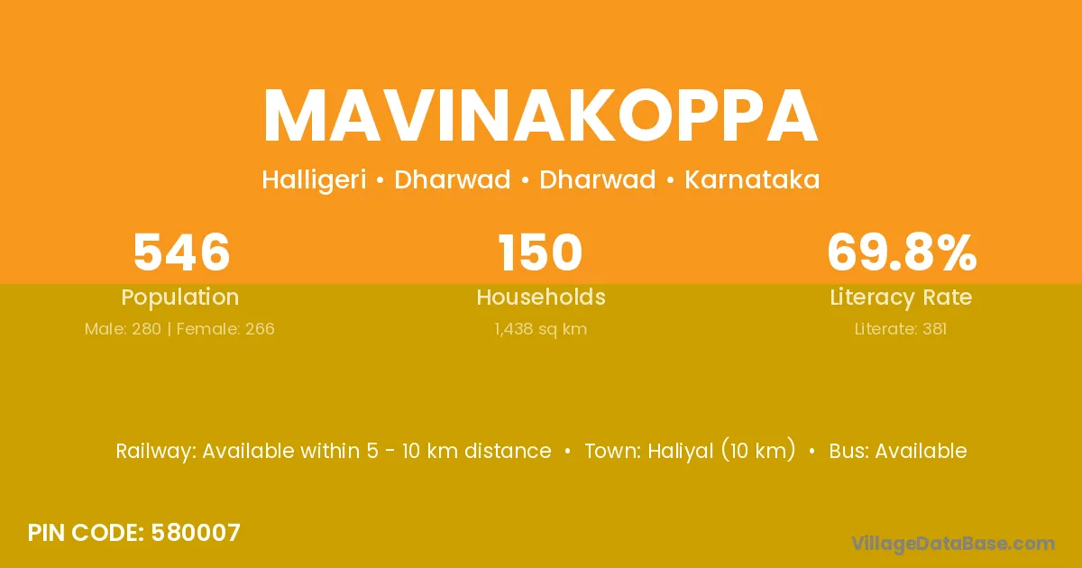 Mavinakoppa village has a total population of 577 people, of which 293 are males and 284 are females.