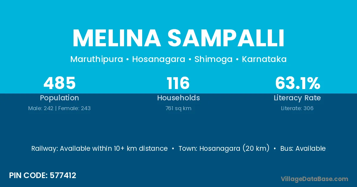 Hosanagara (20 km) is the nearest town to Melina Sampalli village for major economic activities and is located approximately 20 km away.