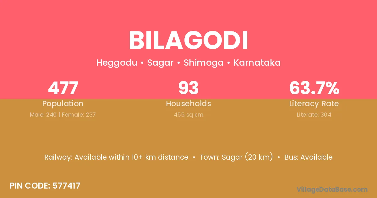 Sagar (20 km) is the nearest town to Bilagodi village for major economic activities and is located approximately 20 km away.