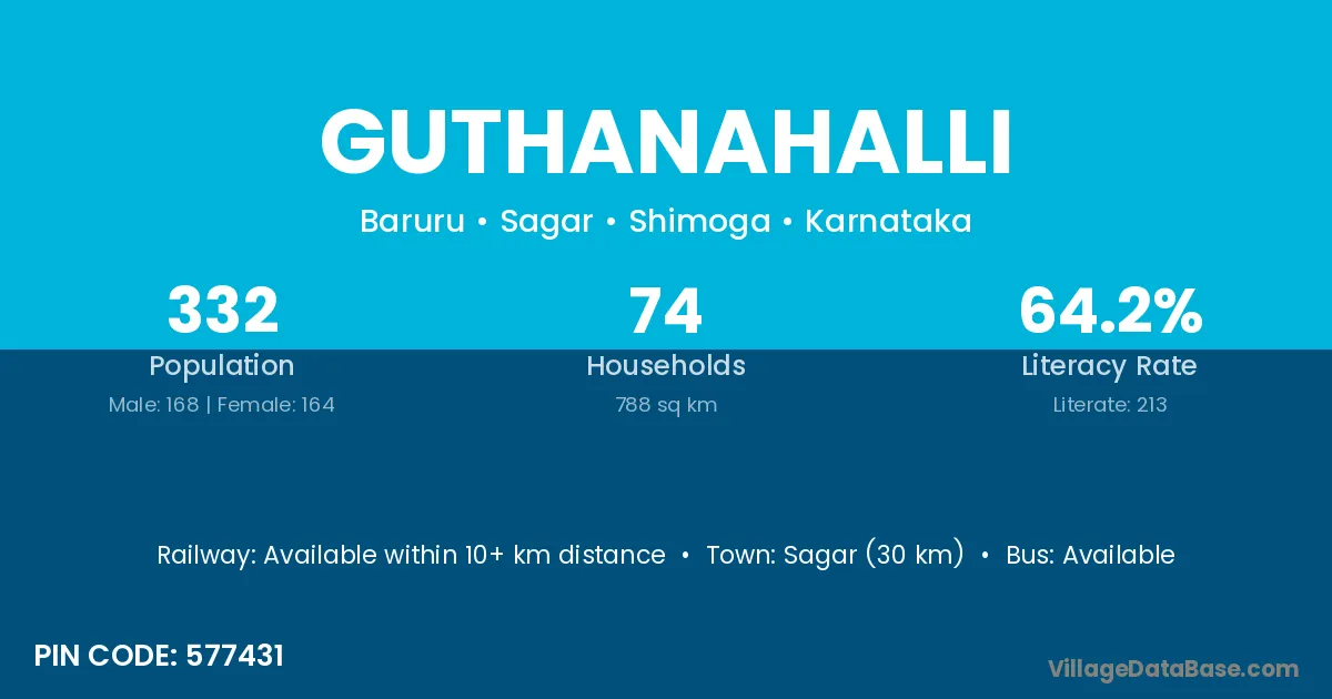 Sagar (30 km) is the nearest town to Guthanahalli village for major economic activities and is located approximately 30 km away.