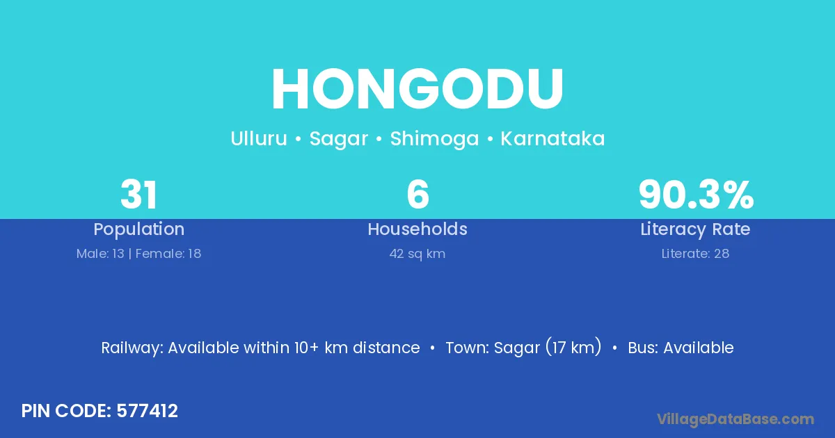 Sagar (17 km) is the nearest town to Hongodu village for major economic activities and is located approximately 17 km away.