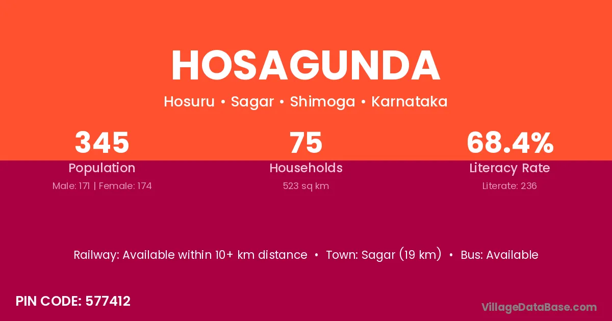 Sagar (19 km) is the nearest town to Hosagunda village for major economic activities and is located approximately 19 km away.