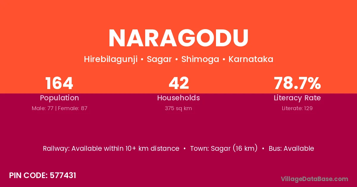 Sagar (16 km) is the nearest town to Naragodu village for major economic activities and is located approximately 16 km away.