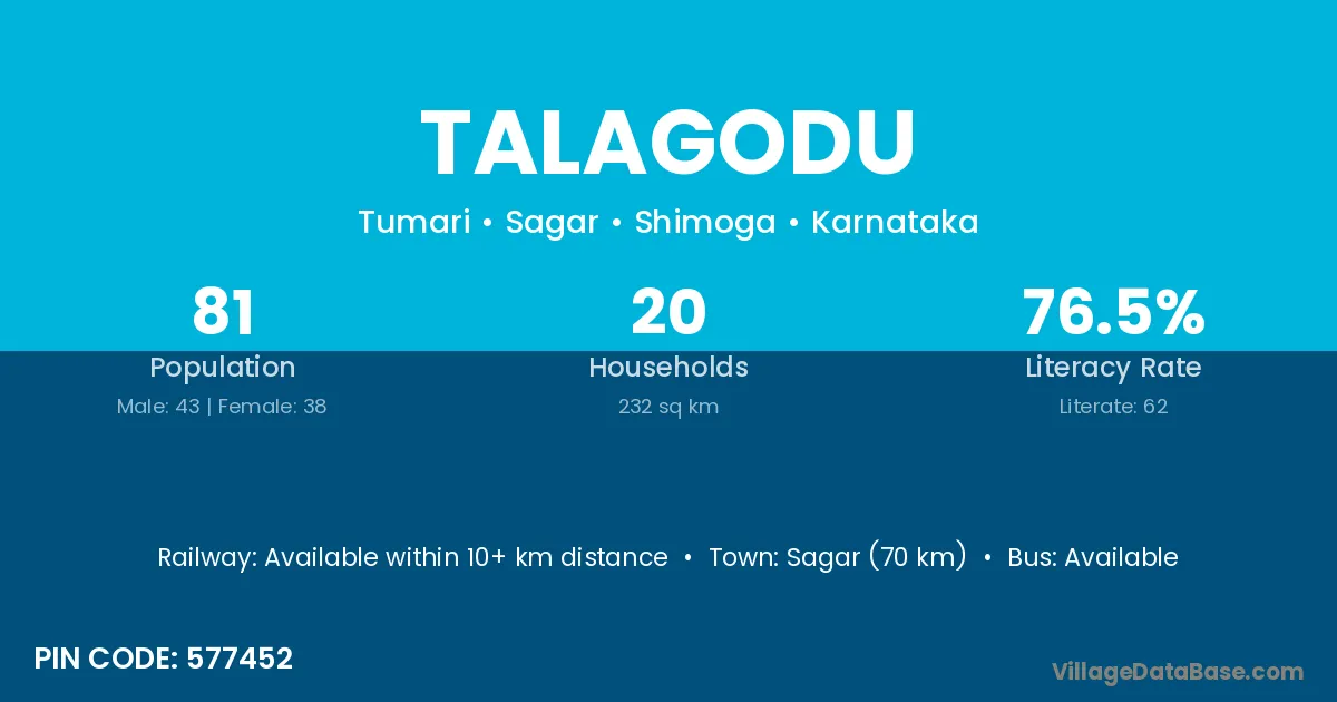 Sagar (70 km) is the nearest town to Talagodu village for major economic activities and is located approximately 70 km away.
