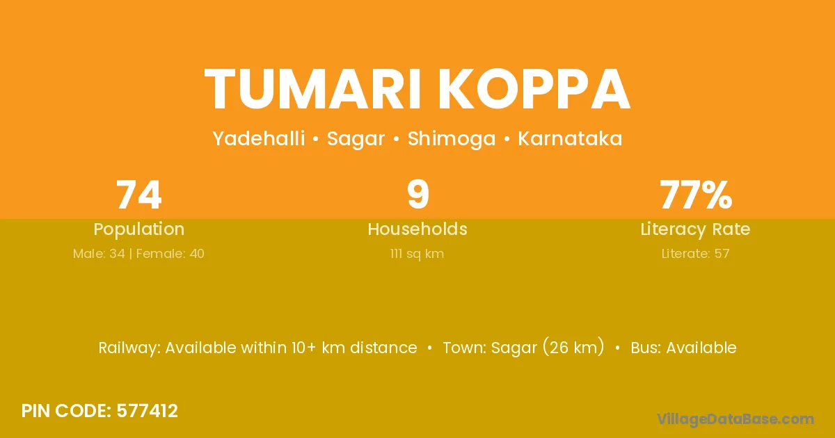 Tumari Koppa village has a total population of 74 people, of which 34 are males and 40 are females.