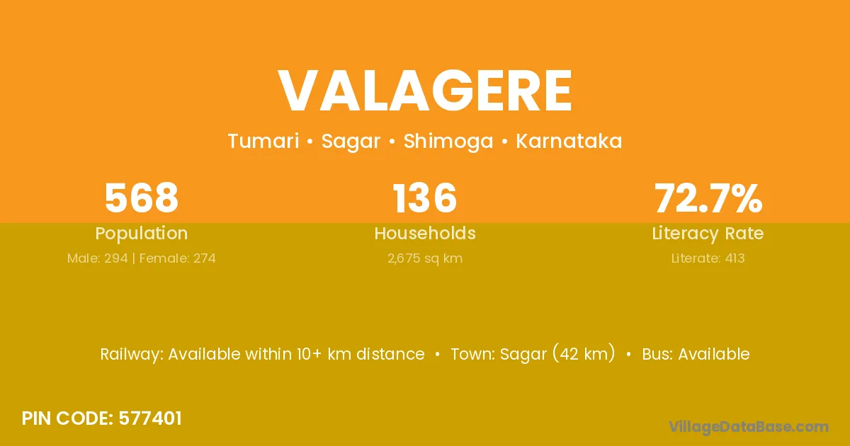 Sagar (42 km) is the nearest town to Valagere village for major economic activities and is located approximately 42 km away.