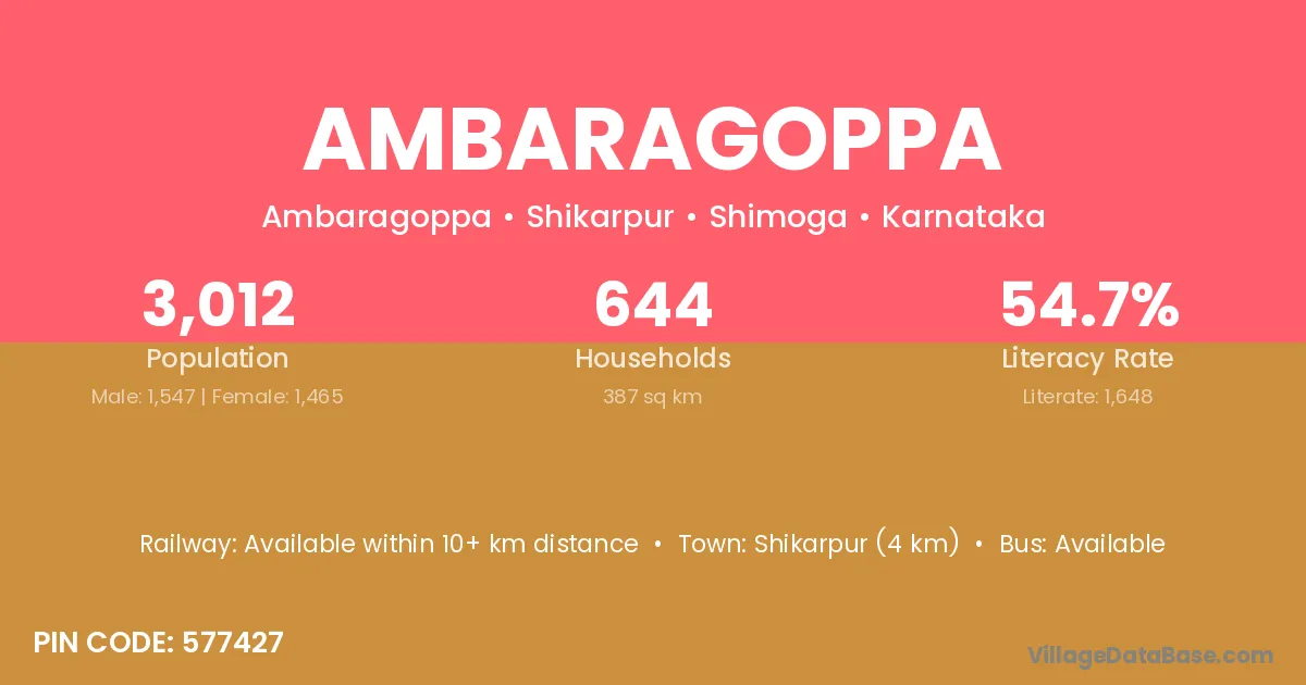Shikarpur (4 km) is the nearest town to Ambaragoppa village for major economic activities and is located approximately 4 km away.