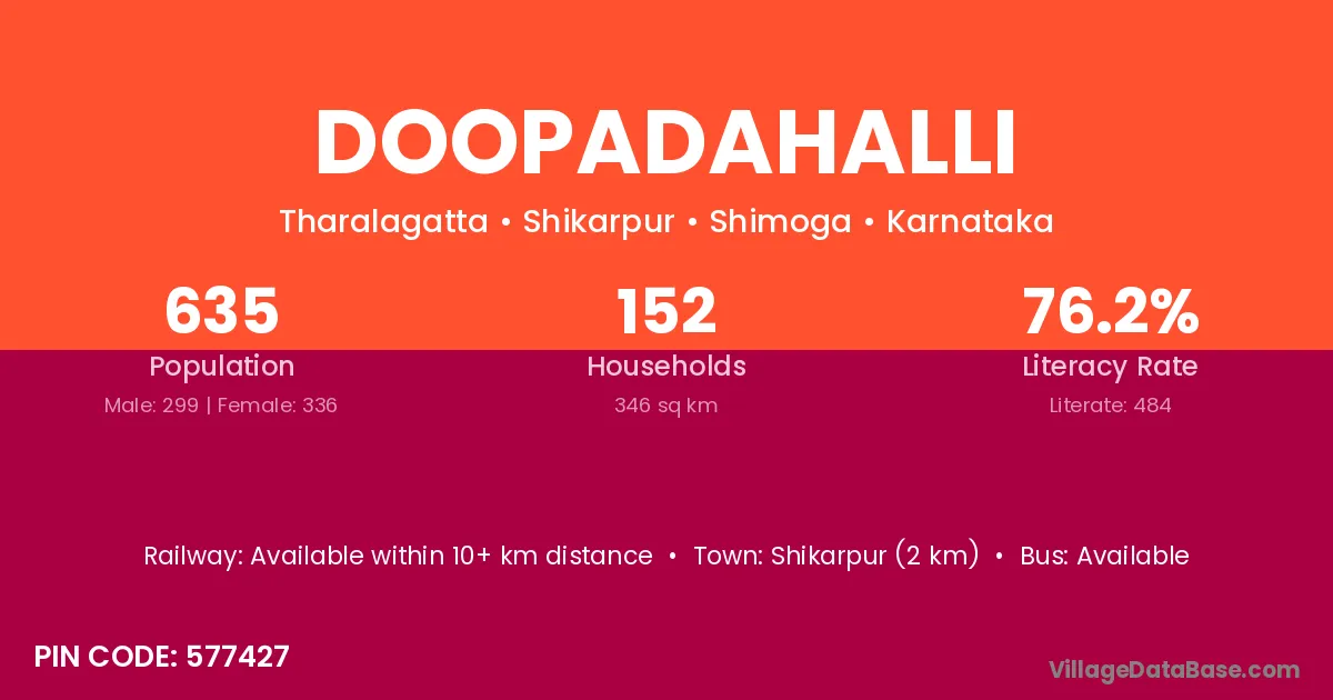 Doopadahalli village has a total population of 635 people, of which 299 are males and 336 are females.
