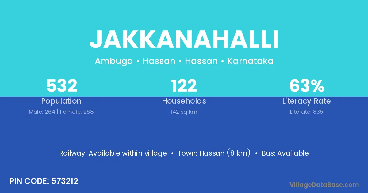 The literacy rate of Jakkanahalli village is 61.91%. Male literacy stands at 67.74% and female literacy at 55.92%.