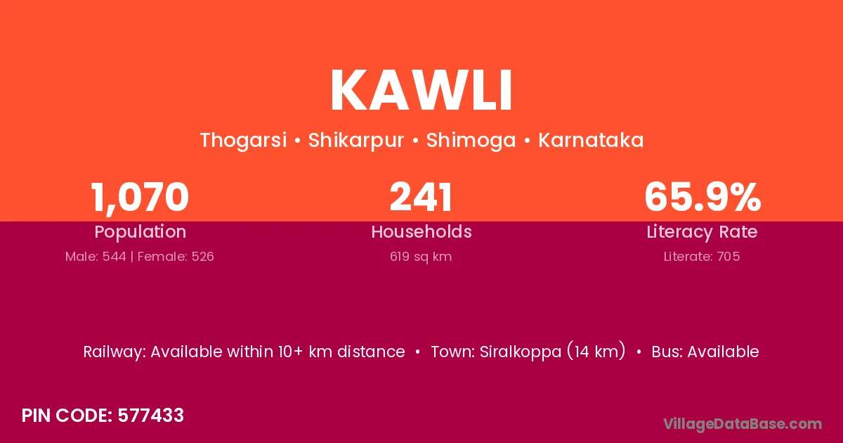 Siralkoppa (14 km) is the nearest town to Kawli village for major economic activities and is located approximately 14 km away.