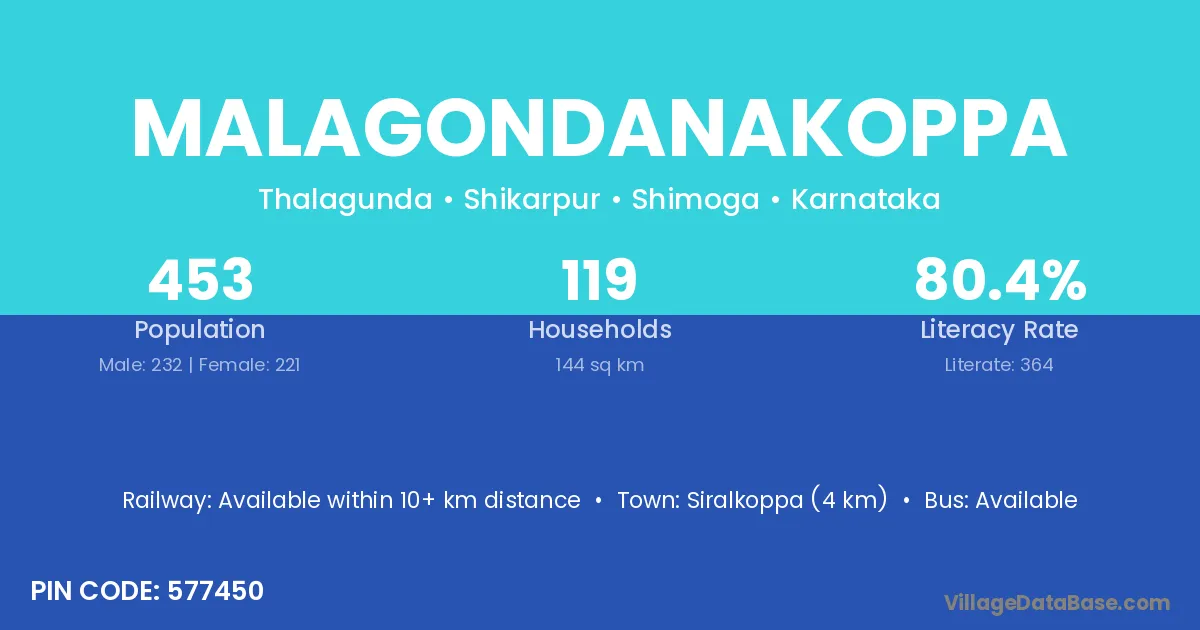 Siralkoppa (4 km) is the nearest town to Malagondanakoppa village for major economic activities and is located approximately 4 km away.