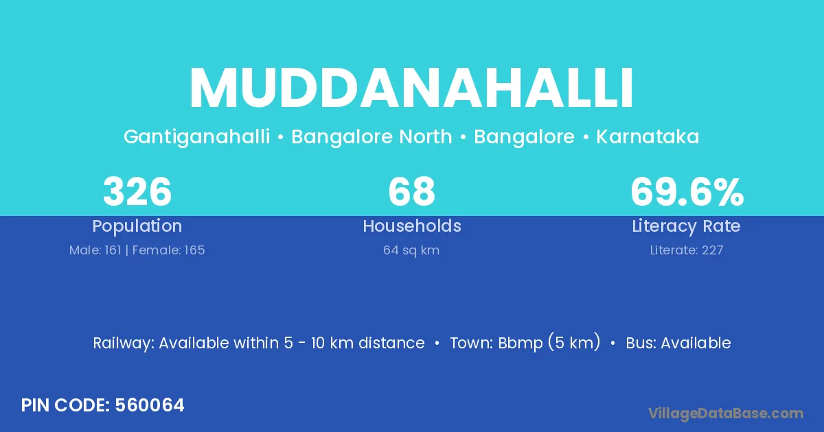 Muddanahalli village has a total population of 1,156 people, of which 608 are males and 548 are females.