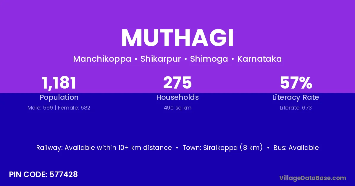 Siralkoppa (8 km) is the nearest town to Muthagi village for major economic activities and is located approximately 8 km away.