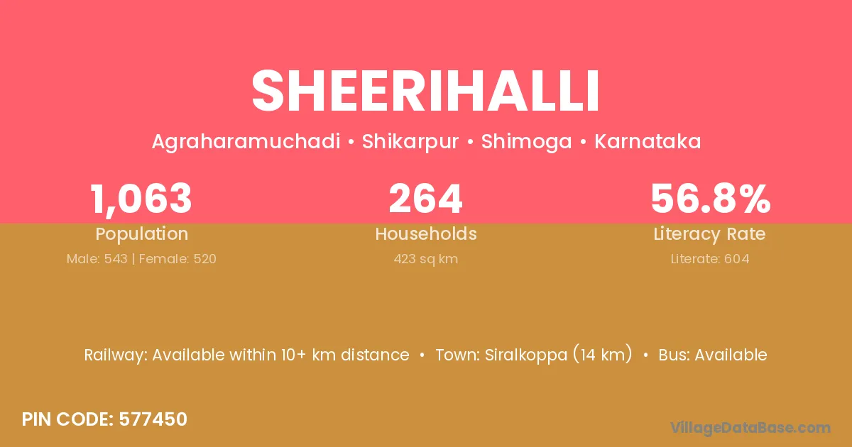 Siralkoppa (14 km) is the nearest town to Sheerihalli village for major economic activities and is located approximately 14 km away.