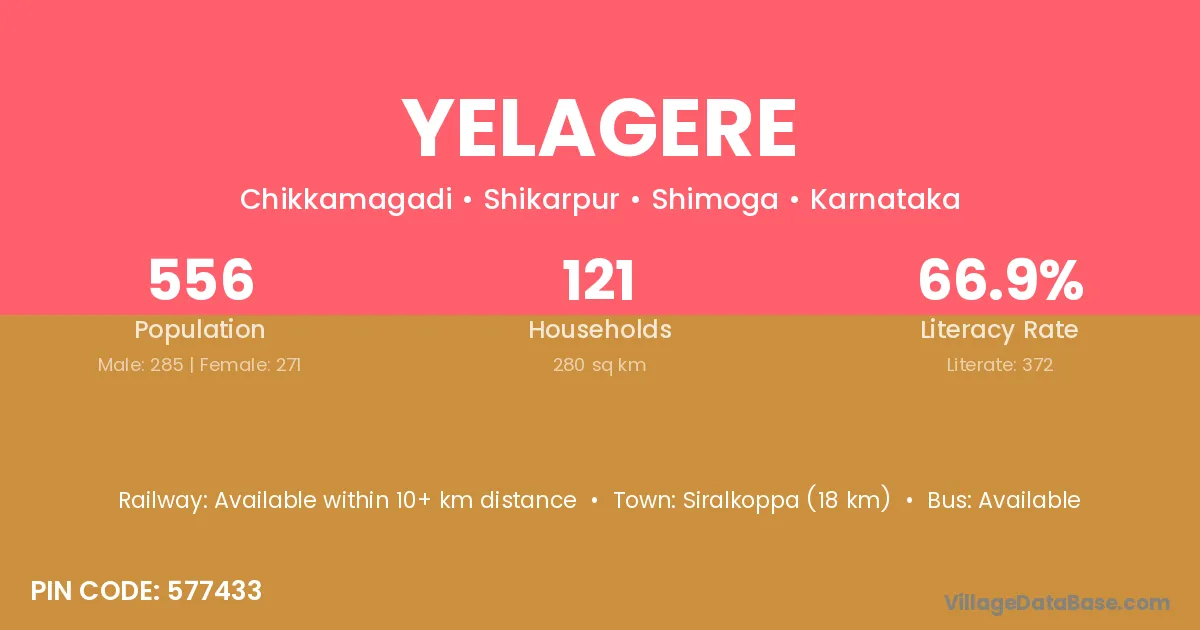 Siralkoppa (18 km) is the nearest town to Yelagere village for major economic activities and is located approximately 18 km away.