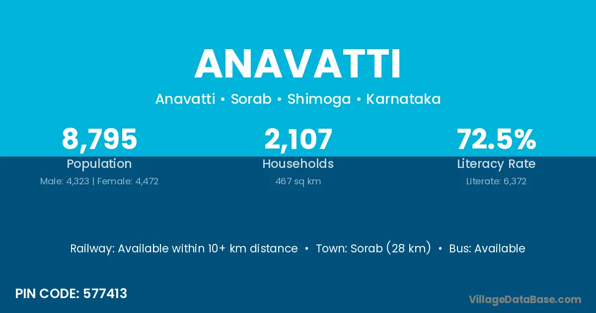 According to Census 2011 information, the village code of Anavatti village is 577413.