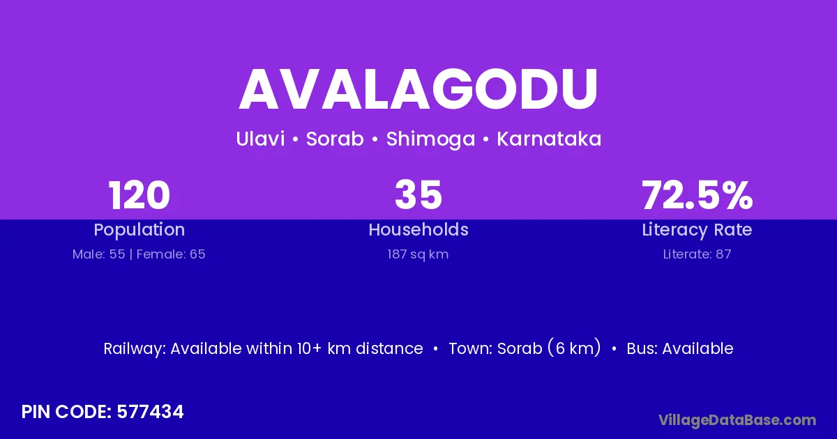 Sorab (6 km) is the nearest town to Avalagodu village for major economic activities and is located approximately 6 km away.
