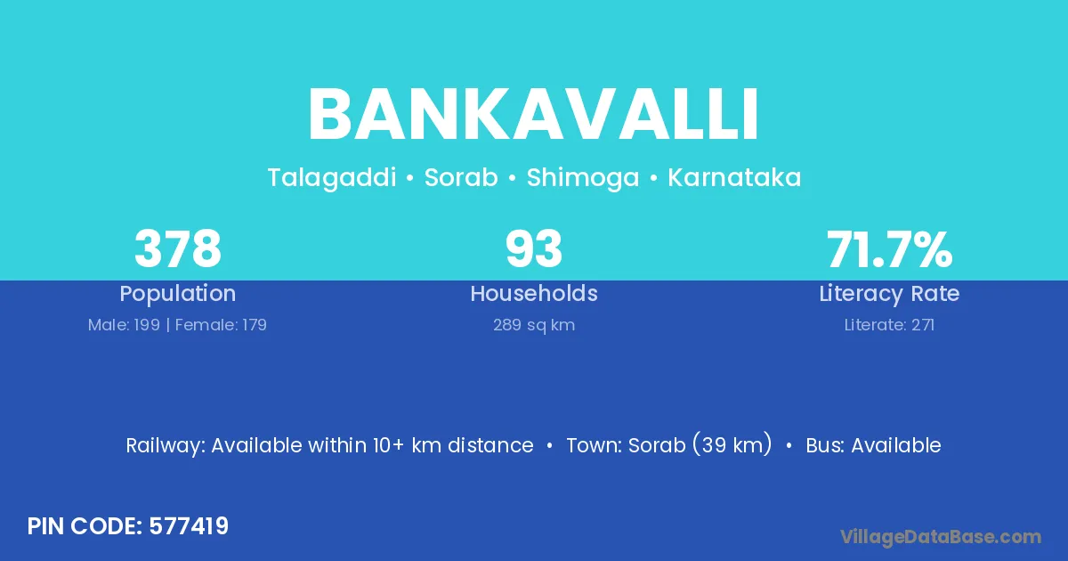 Bankavalli village has a total population of 378 people, of which 199 are males and 179 are females.