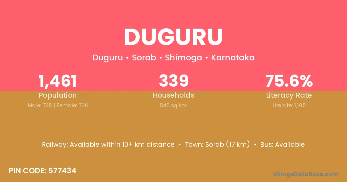 Sorab (17 km) is the nearest town to Duguru village for major economic activities and is located approximately 17 km away.
