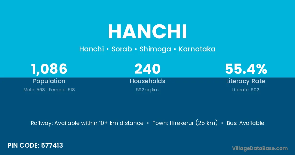 Hirekerur (25 km) is the nearest town to Hanchi village for major economic activities and is located approximately 25 km away.