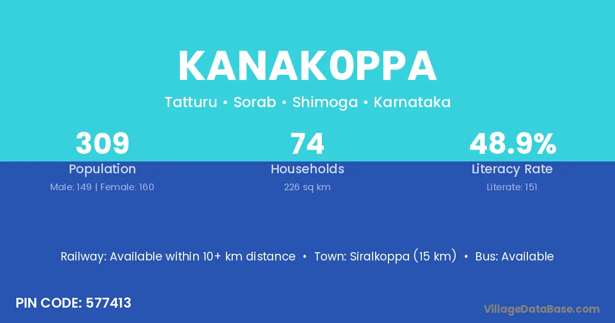 Siralkoppa (15 km) is the nearest town to Kanak0ppa village for major economic activities and is located approximately 15 km away.