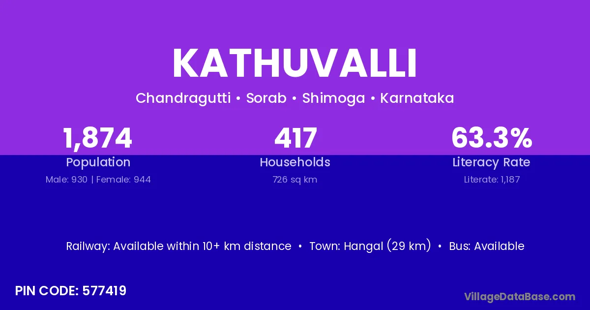 Hangal (29 km) is the nearest town to Kathuvalli village for major economic activities and is located approximately 29 km away.