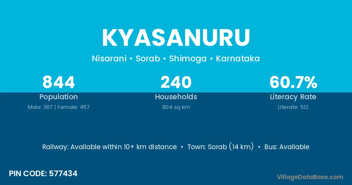 Sorab (14 km) is the nearest town to Kyasanuru village for major economic activities and is located approximately 14 km away.