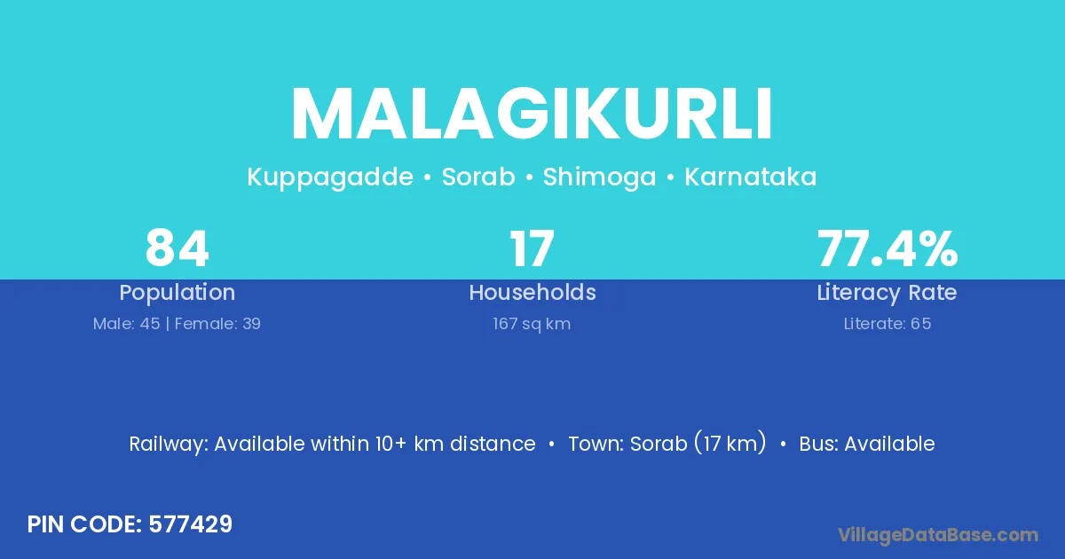 Sorab (17 km) is the nearest town to Malagikurli village for major economic activities and is located approximately 17 km away.