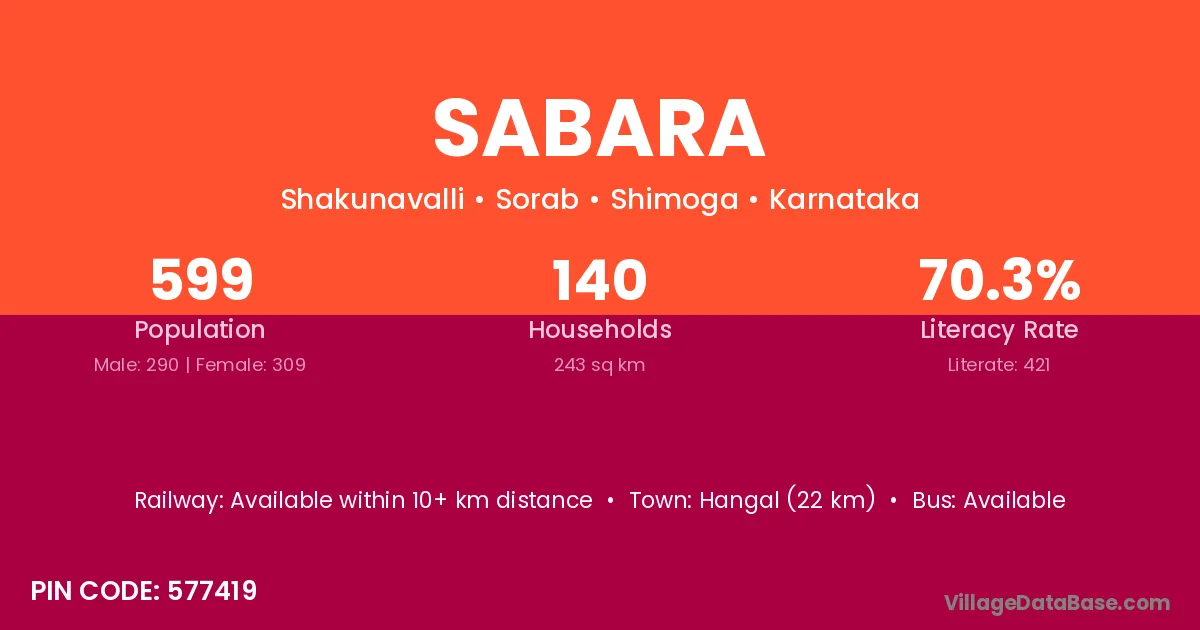 Hangal (22 km) is the nearest town to Sabara village for major economic activities and is located approximately 22 km away.