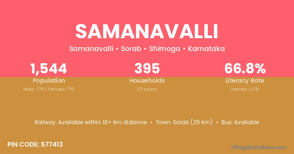 Sorab (25 km) is the nearest town to Samanavalli village for major economic activities and is located approximately 25 km away.