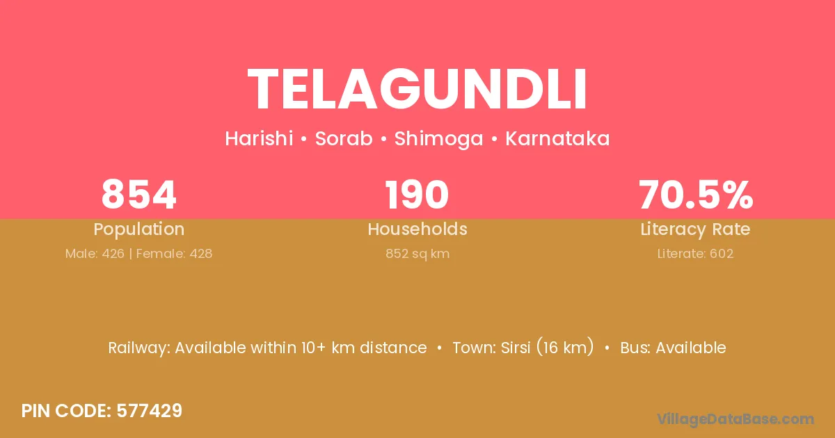 Sirsi (16 km) is the nearest town to Telagundli village for major economic activities and is located approximately 16 km away.