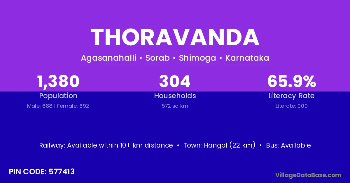 Hangal (22 km) is the nearest town to Thoravanda village for major economic activities and is located approximately 22 km away.