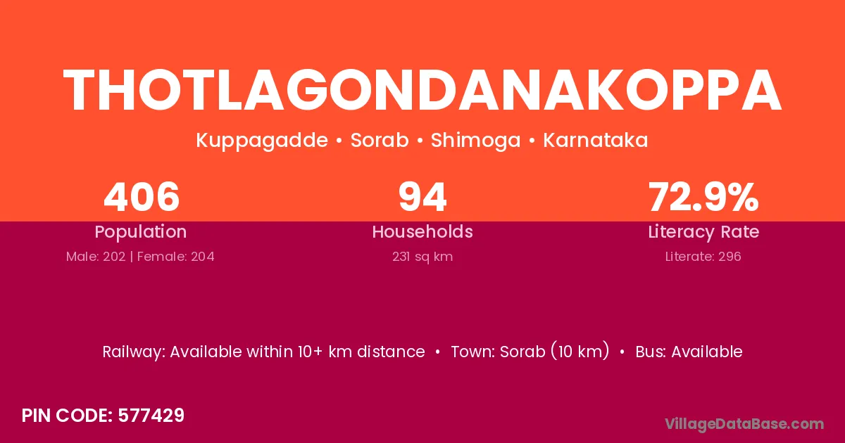 Thotlagondanakoppa village has a total population of 406 people, of which 202 are males and 204 are females.