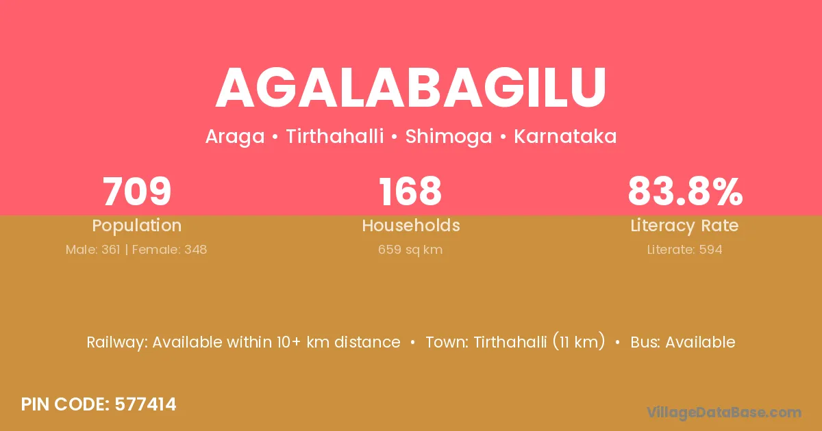 Tirthahalli (11 km) is the nearest town to Agalabagilu village for major economic activities and is located approximately 11 km away.