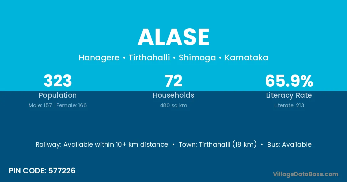 Tirthahalli (18 km) is the nearest town to Alase village for major economic activities and is located approximately 18 km away.