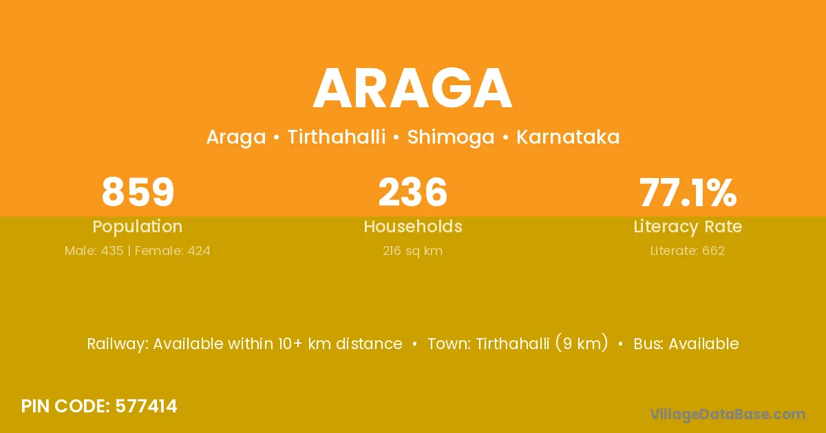 Tirthahalli (9 km) is the nearest town to Araga village for major economic activities and is located approximately 9 km away.