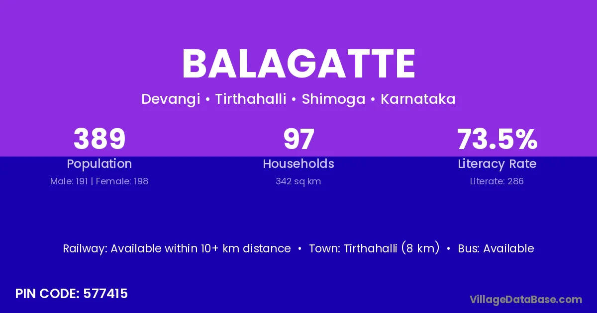 Tirthahalli (8 km) is the nearest town to Balagatte village for major economic activities and is located approximately 8 km away.